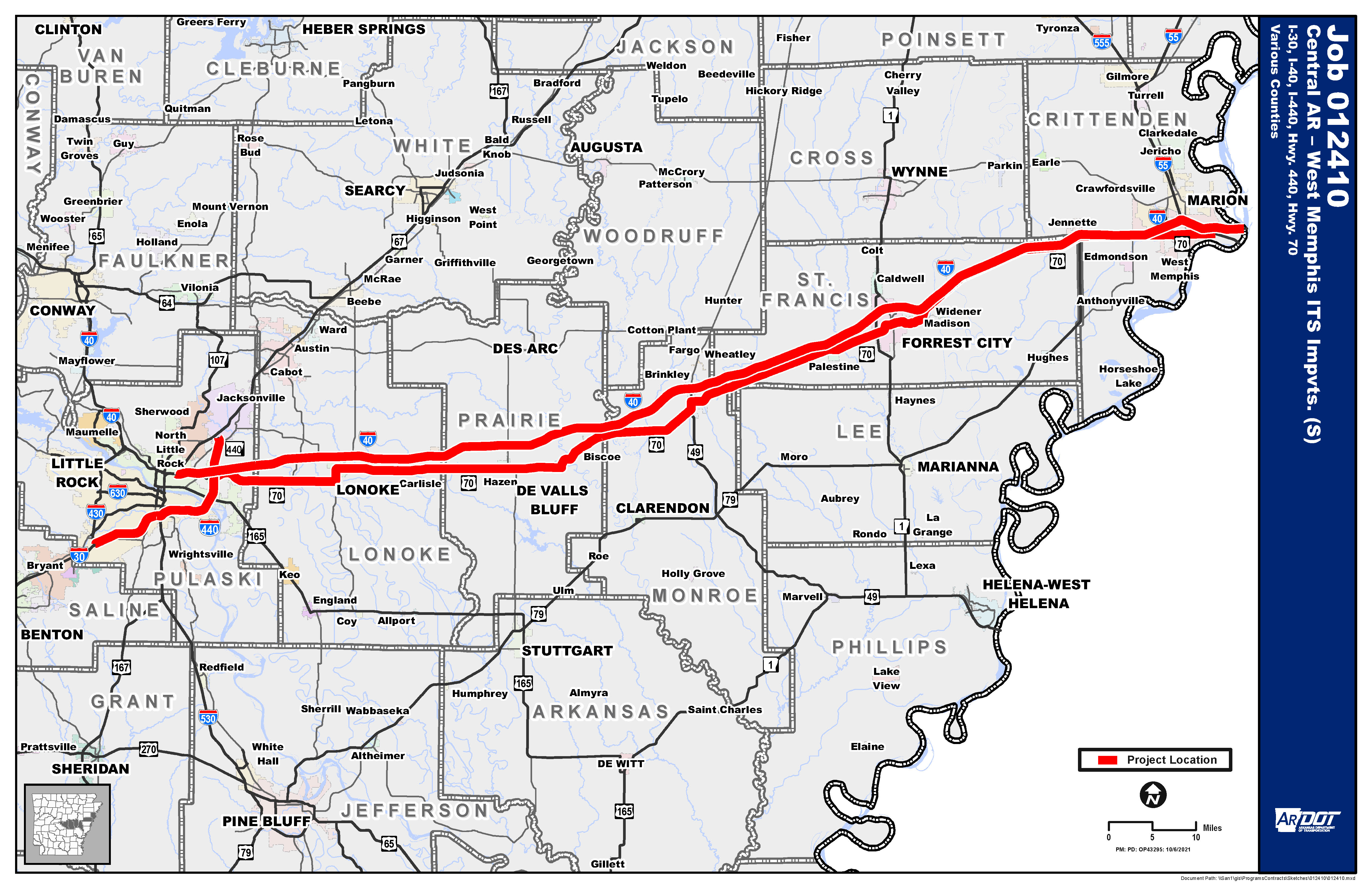 The Arkansas Department of Transportation (ARDOT) is proposing use of an intelligent transportation system (ITS) along the I-40 corridor, from central Arkansas to West Memphis.β―This project will include plans for alternative routing to keep traffic moving in the event of a major incident on I-40, along with new technology, such as message signs, cameras, wrong-way detections, signal modifications, and way-finding signs. Corridor and/or intersection widening is not planned as part of this project.